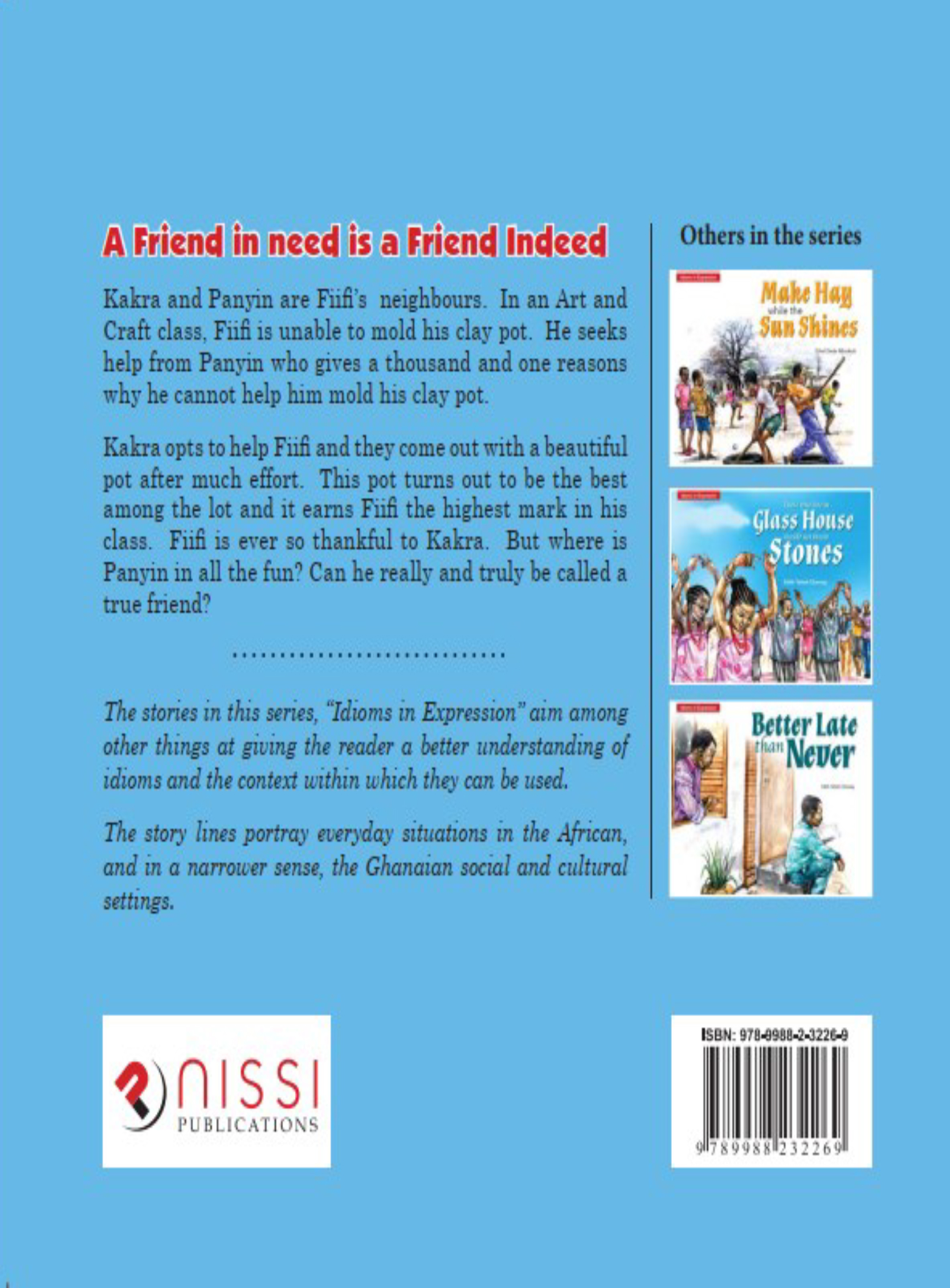 Fiifi and his two friends, Kakra and Panyin are neighbours. In an Art and Craft class, Fiifi cannot mold his clay pot. He asks Panyin to help him complete his art work over the weekend, but Panyin gives a thousand and one reasons why he cannot help.